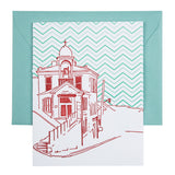 Ellicott City brings the days of old to our current time. This 2 color letterpress card illustrates Main Street in downtown Ellicott City, Maryland. There is a Moroccan tile pattern in the background and a short blurb about the history of Ellicott City on the back of the card.