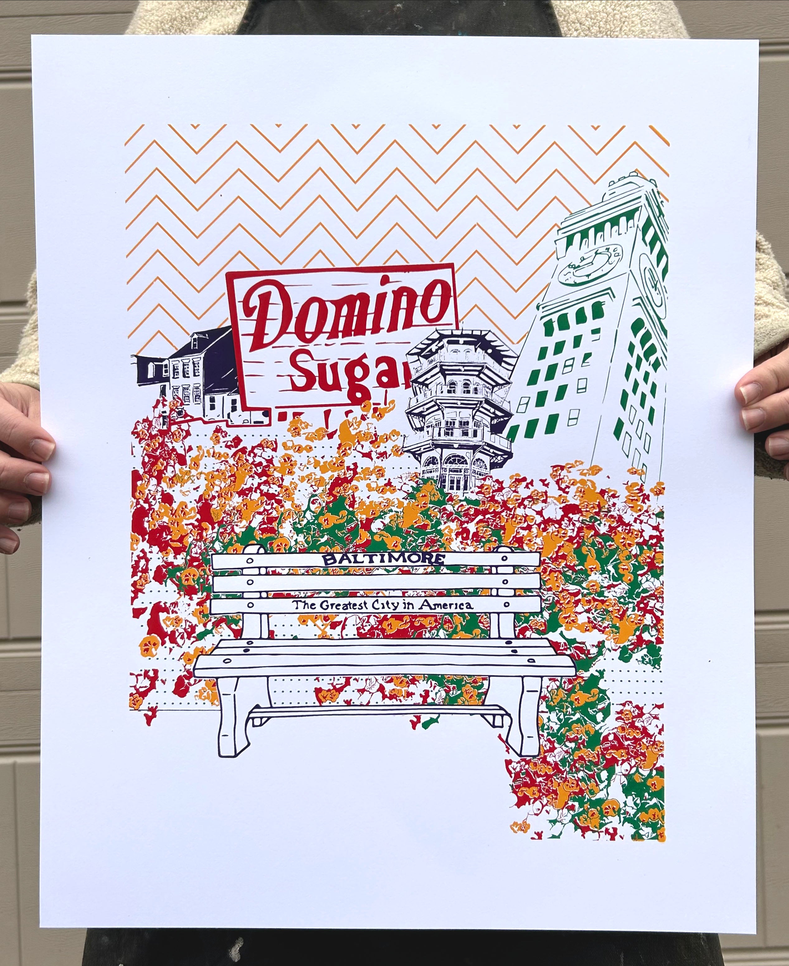 Baltimore is full of history, icons and stories. This 4 color silk screen poster illustrates the the Bromo Seltzer Tower, Domino Sugars sign, Fells Point Thames Street, Patterson Park Pagoda and the infamous city benches.