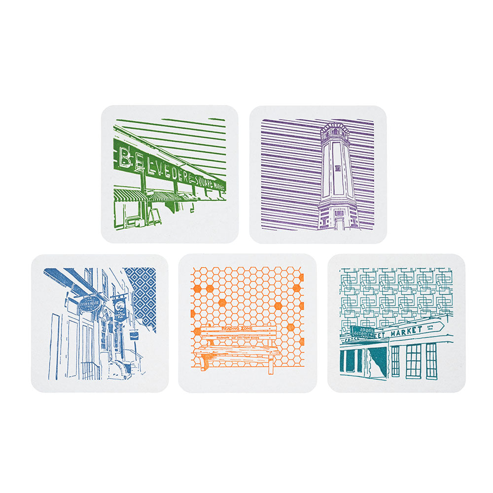 Package of 5 letterpress printed Baltimore coasters. You will receive one of each design in one pack! Designs included are Belvedere Square, Roland Water Tower, Thames Street, Reading Zone bench, and Cross Street Market.