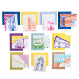 Each card is 2 color letterpress printed fold-over card with a colored blank envelope. Each card has a short blurb on the history of either the location or neighborhood the card is illustrating.